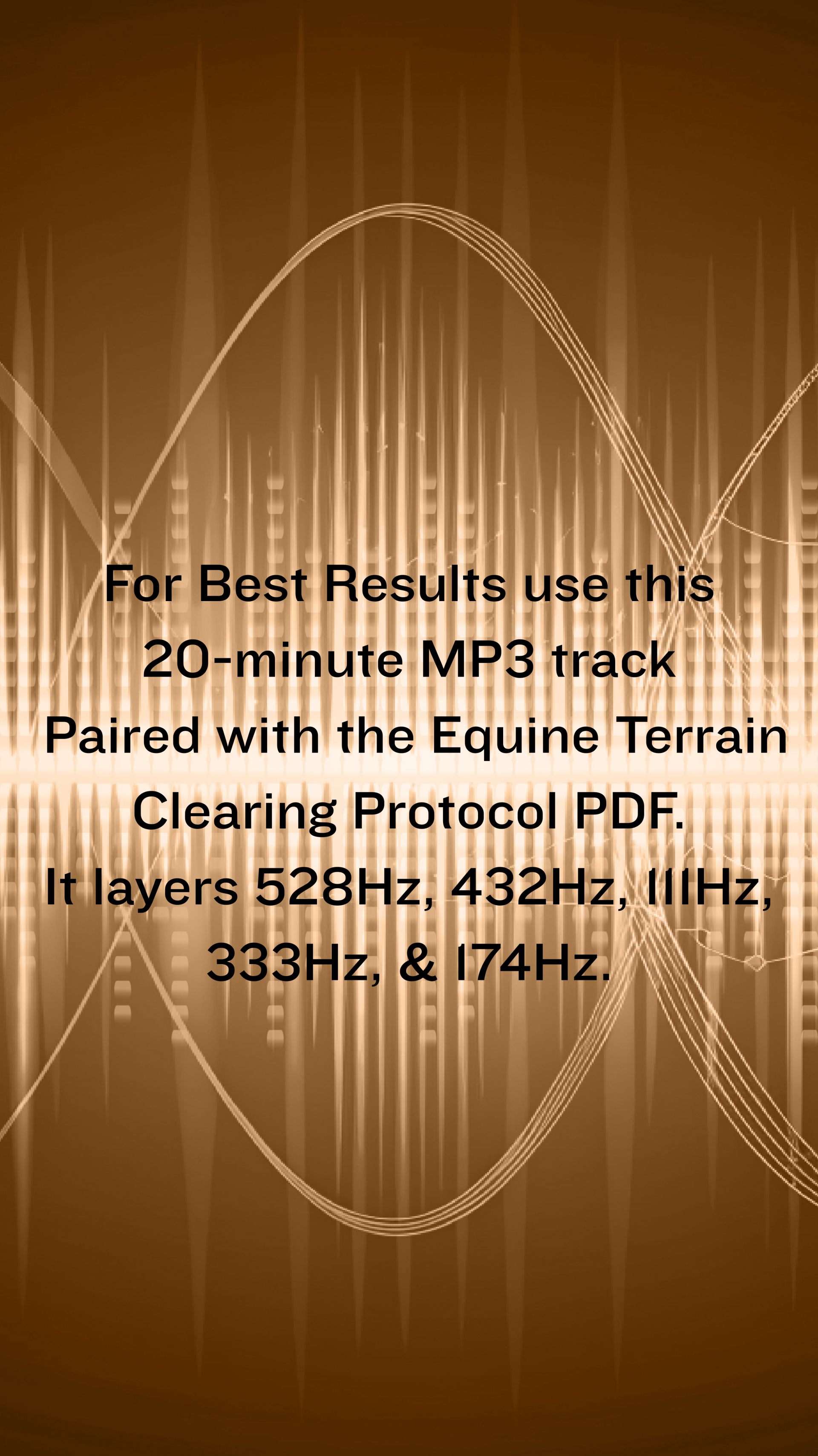 Download your 20-minute frequency audios for Equine Biofield Restoration. Pair them will the Equine Terrain - Clearing Protocol PDF. The Vi -Clear 20 min audio layers 317Hz, 174Hz and 7.83Hz and the Horse Terrain Clearing 20min audio layers 528Hz, 432Hz, 111Hz, 333Hz, and 174Hz, designed for playback in a stall or calm pasture setting. Please notate this works best when used on a strong bass speaker used in a stall with the horse. We recommend playing this track several times throughout the day for best results. Once the track is downloaded please do not share this. These tracks are exclusive to Roots Mercantile. Each customer needs to purchase their own download. They are not to be shared freely. We thank you for honoring our request.